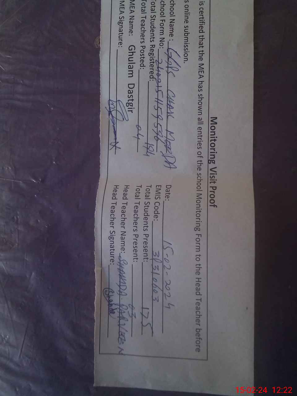 | Attendance Register | Head Teacher | MEA with School | Visit Proof |