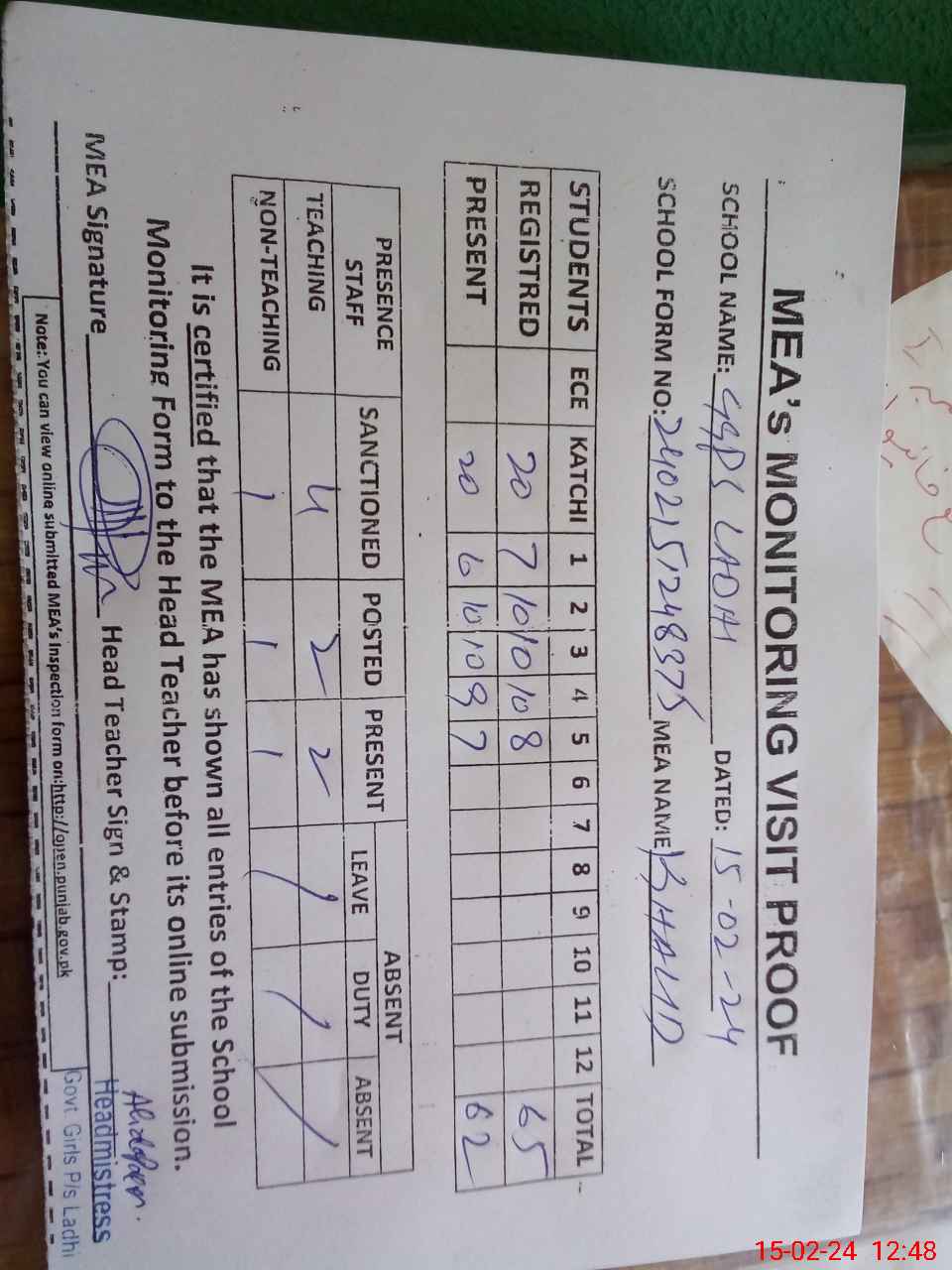 | EMIS Code: 36430370 | Name of School: GGPS LADHI, TULAMBA | |||