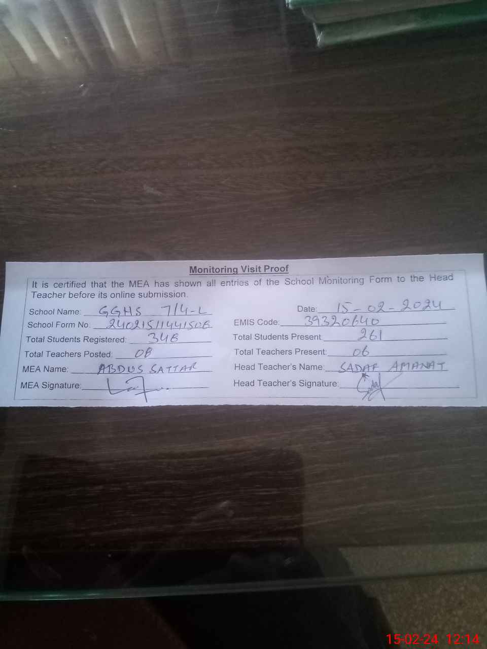 | EMIS Code: 39320640 | Name of School: GGHS CHAK NO. 7/4-L | |||