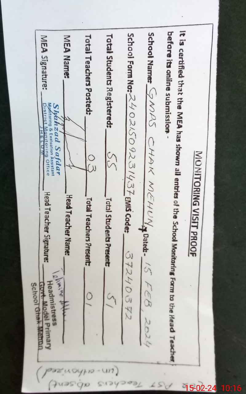 | EMIS Code: 37240372 | Name of School: GMPS CHAK MEHUN | |||