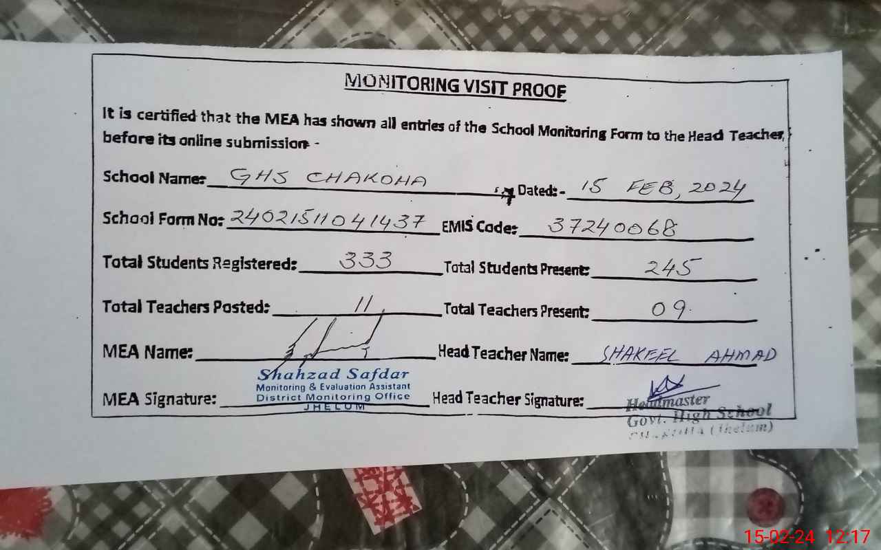 | EMIS Code: 37240068 | Name of School: GHS CHAKOHA | |||