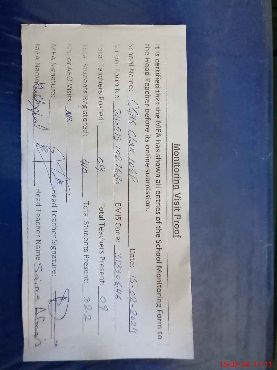 | EMIS Code: 31330646 | Name of School: GGHS 106/P R.Y.KHAN | |||