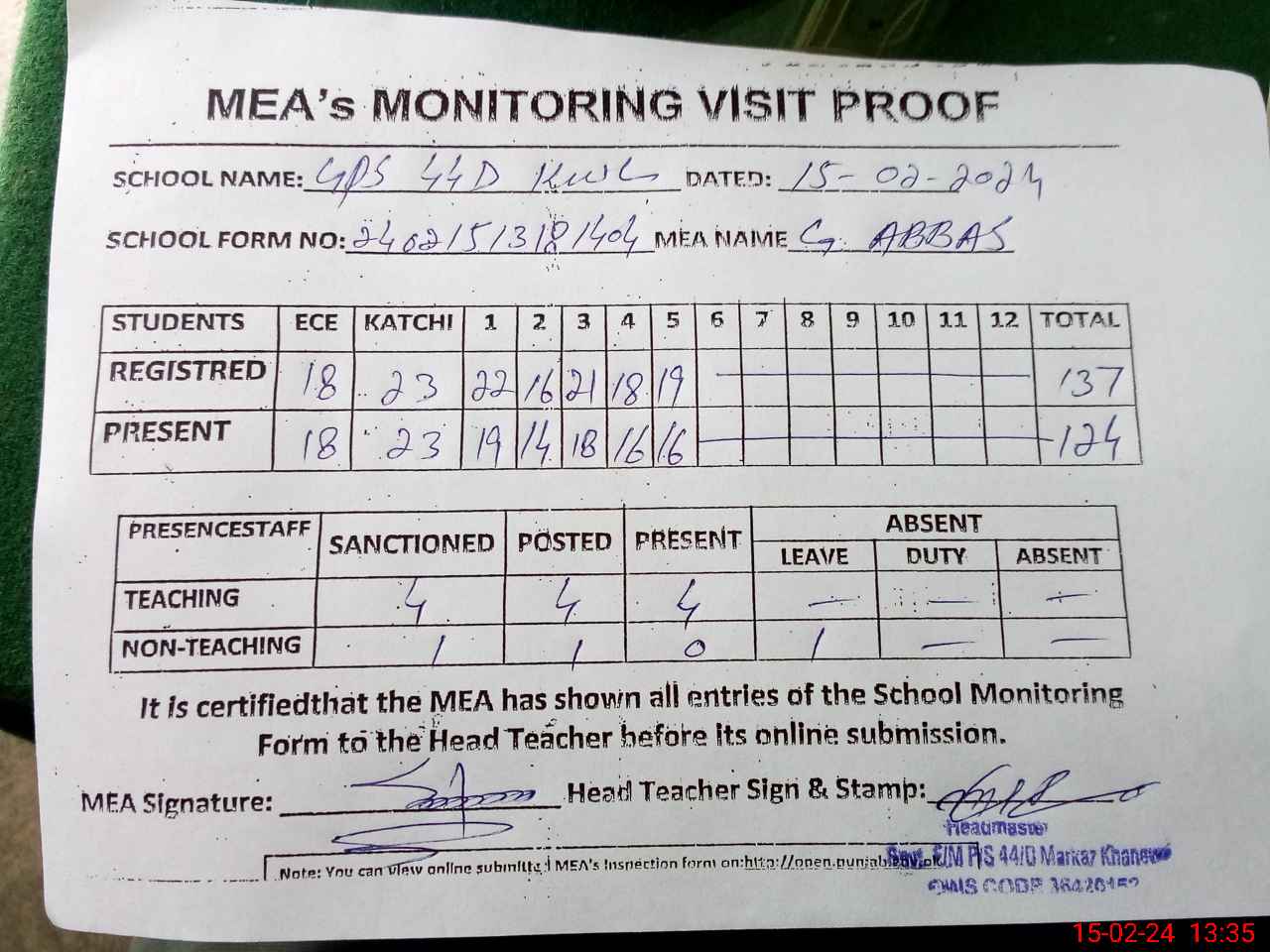 | Attendance Register | Head Teacher | MEA with School | Visit Proof |