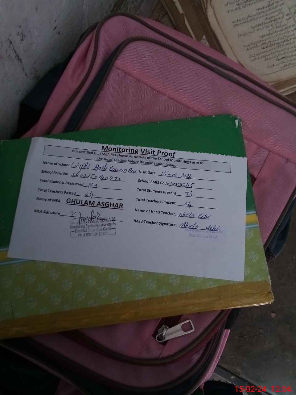 | Attendance Register | Head Teacher | MEA with School | Visit Proof |
