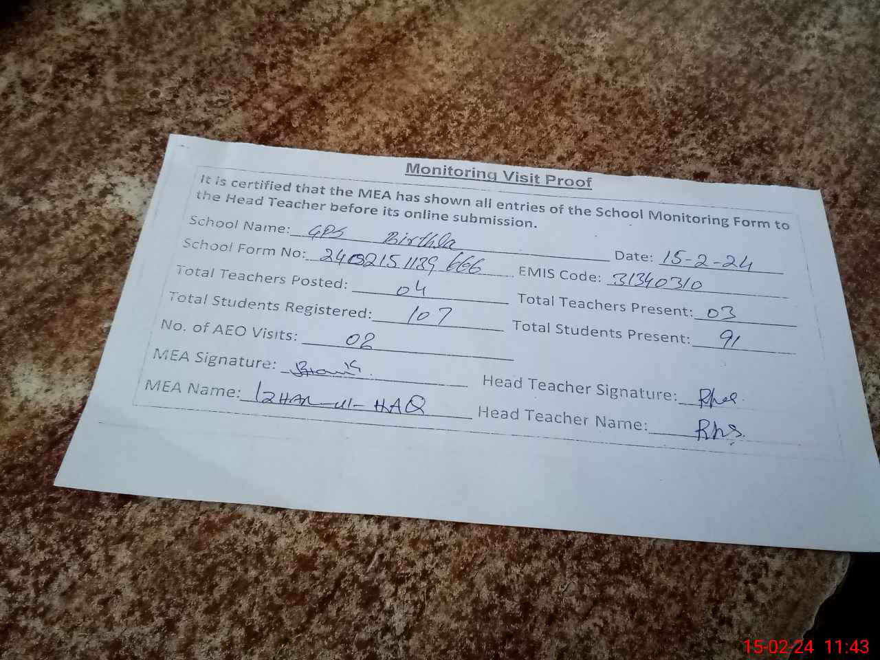| Attendance Register | Head Teacher | MEA with School | Visit Proof |