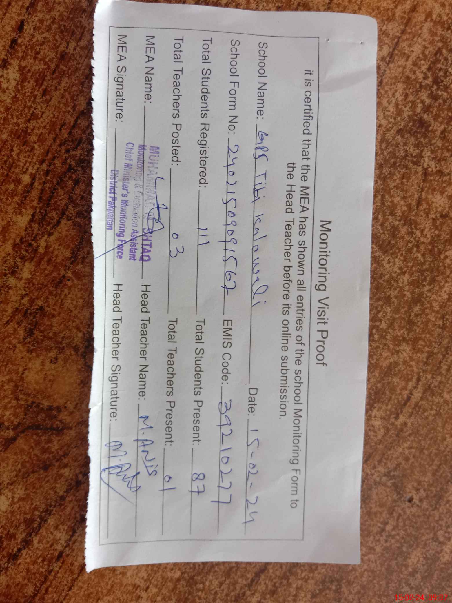 | Attendance Register | Head Teacher | MEA with School | Visit Proof |