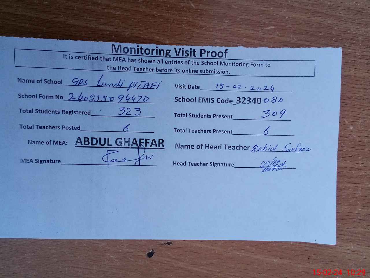 | Attendance Register | Head Teacher | MEA with School | Visit Proof |