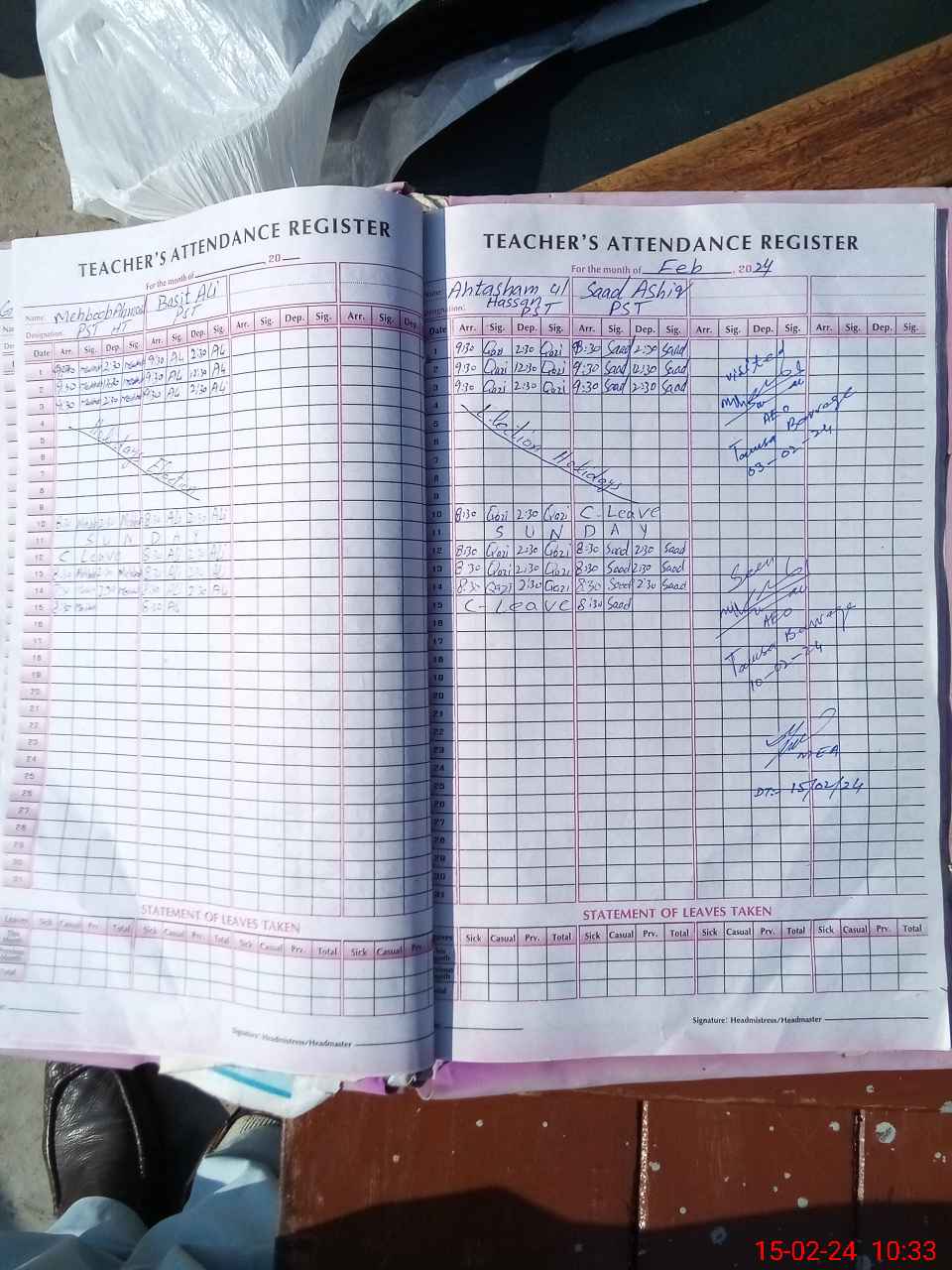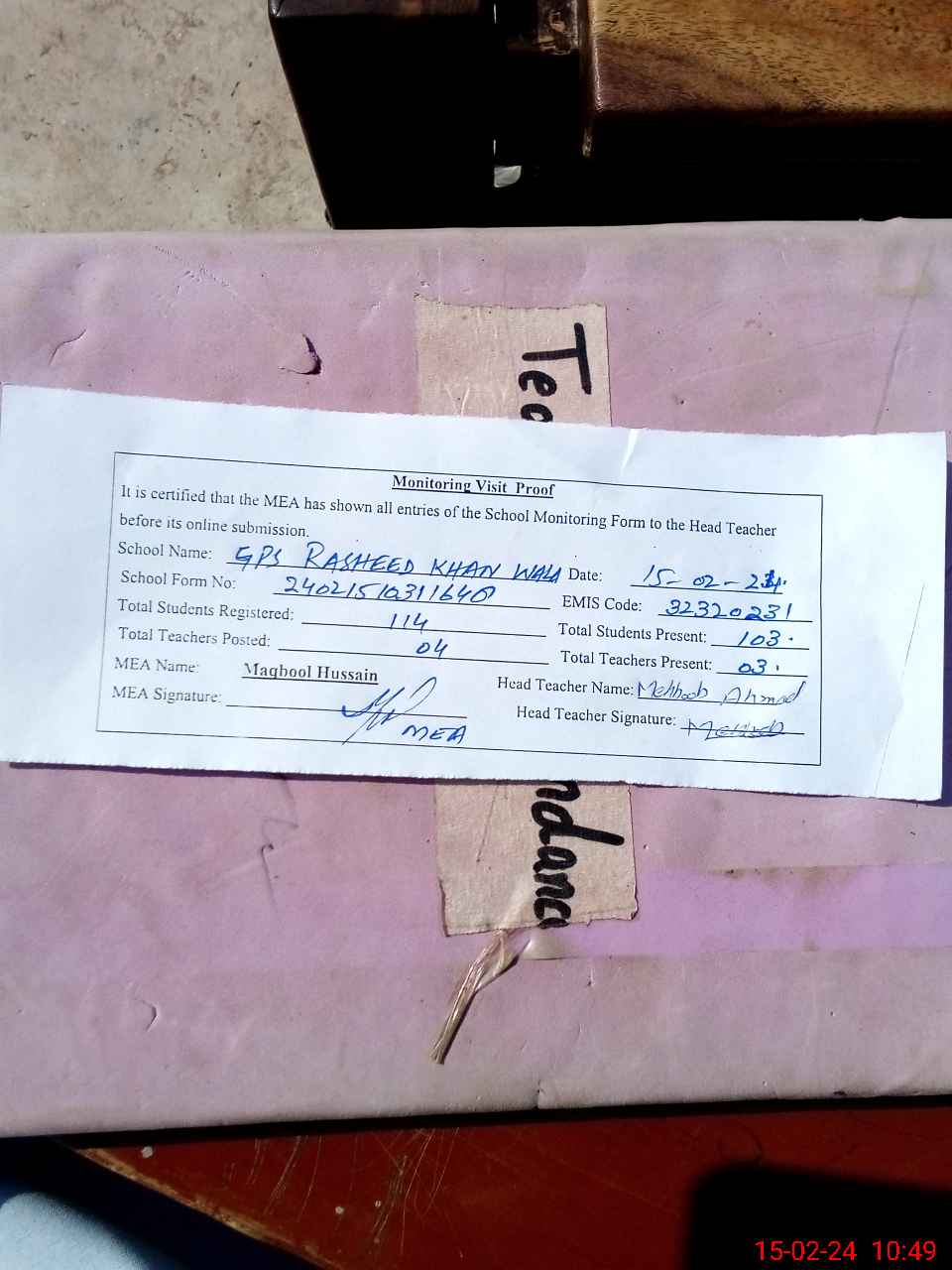 | Attendance Register | Head Teacher | MEA with School | Visit Proof |
