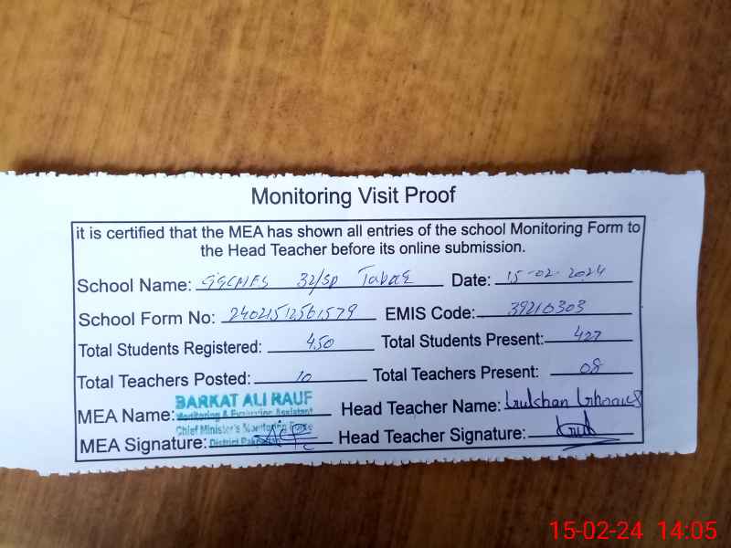 | EMIS Code: 39210303 | Name of School: GGHS CHAK NO.32 SP TABAR | |||