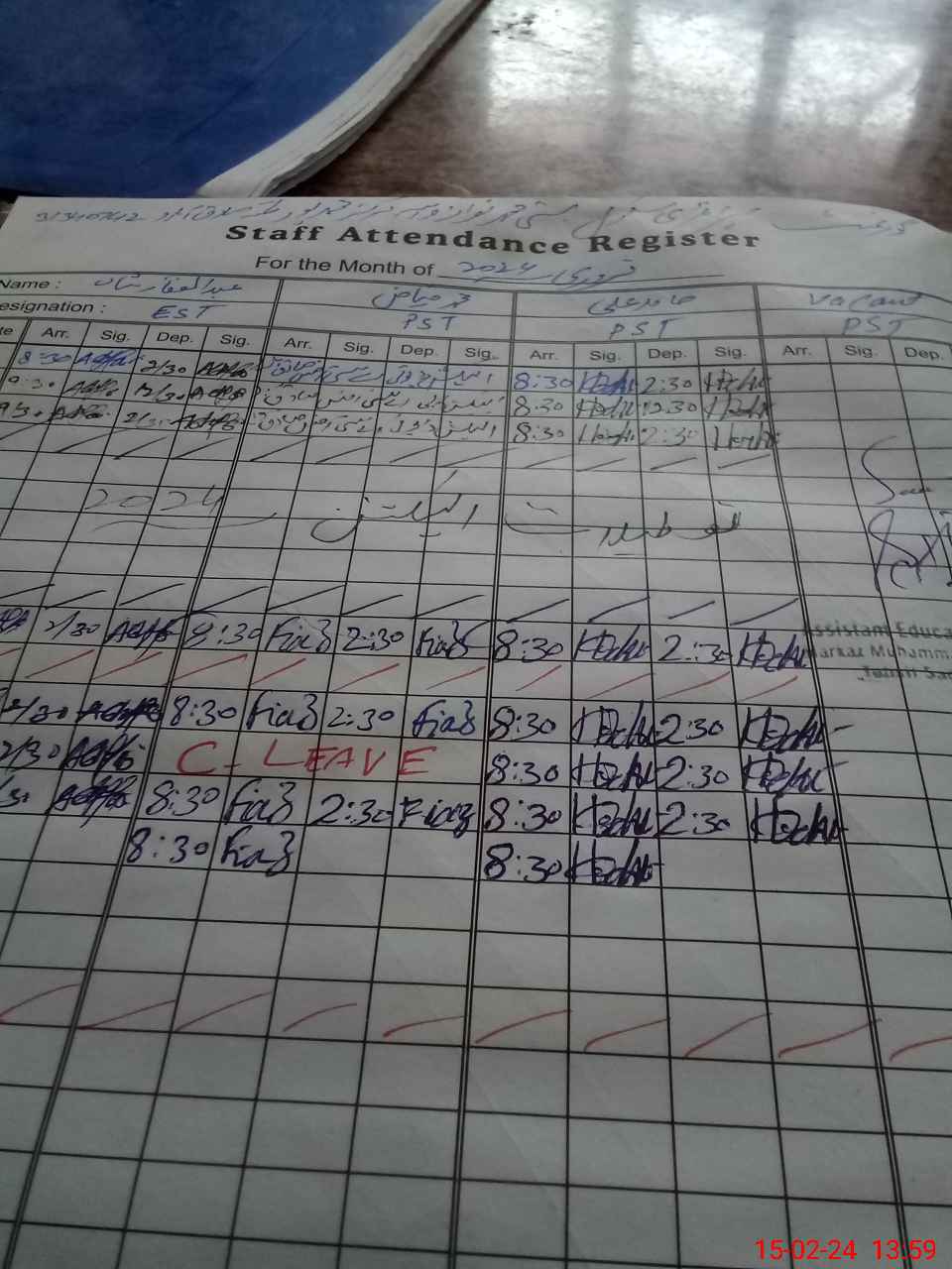 | CNIC | Full Name | Designation | R/C | Absence During Last Calender Month |