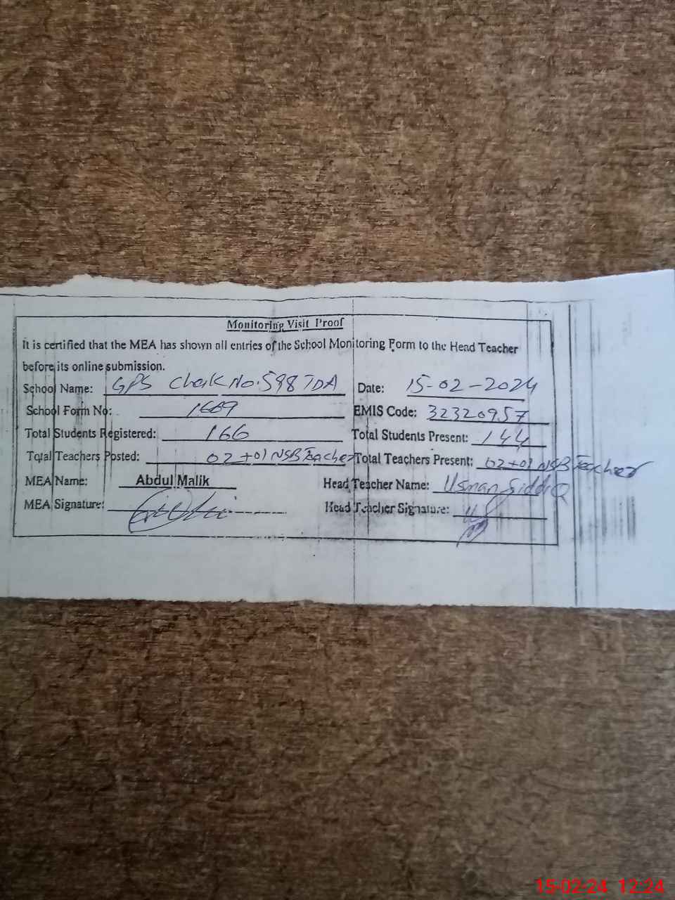 | Attendance Register | Head Teacher | MEA with School | Visit Proof |
