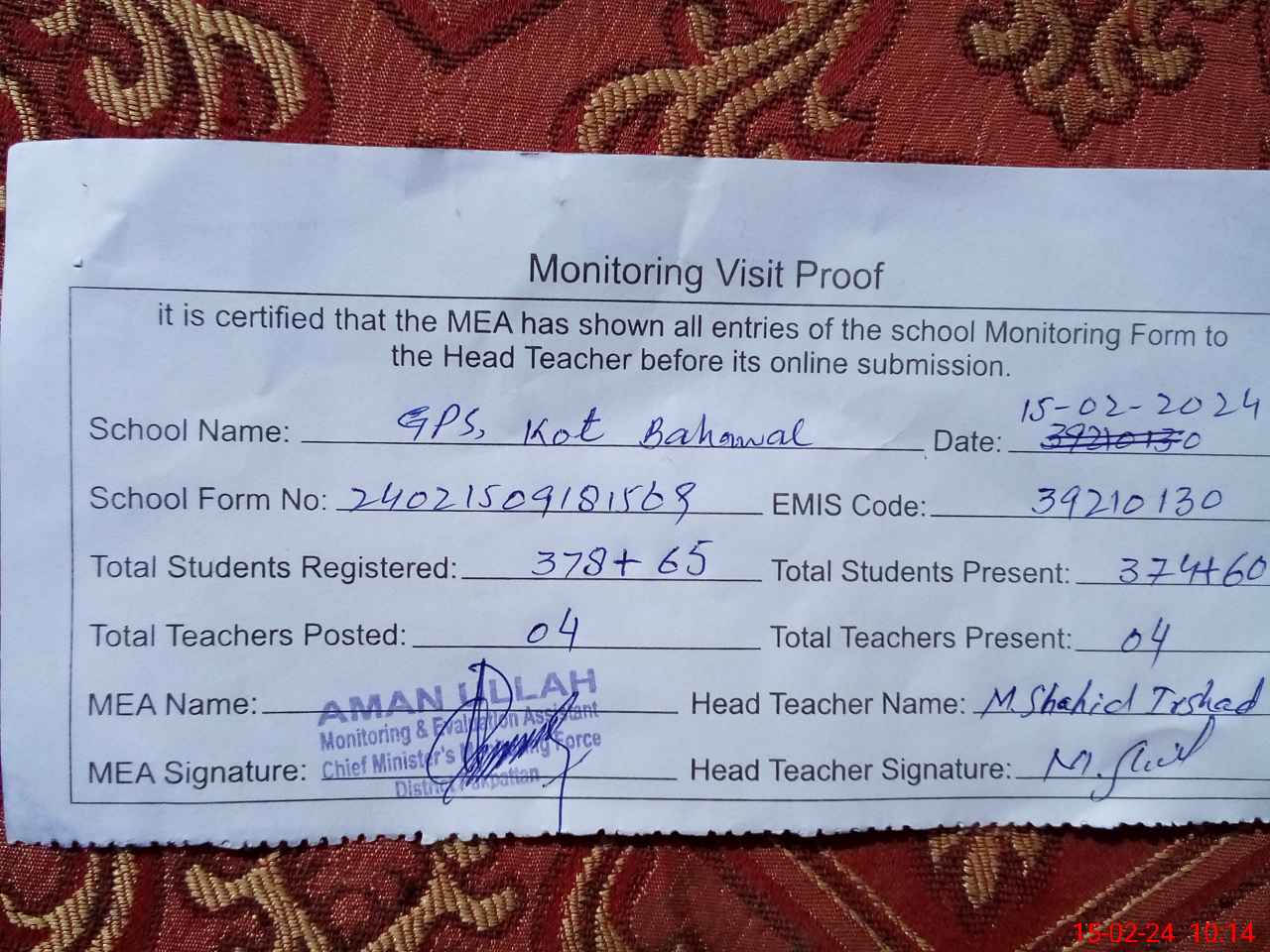 | Attendance Register | Head Teacher | MEA with School | Visit Proof |