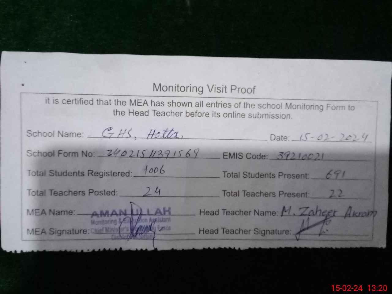 | EMIS Code: 39210021 | Name of School: GHS HOTTA | |||