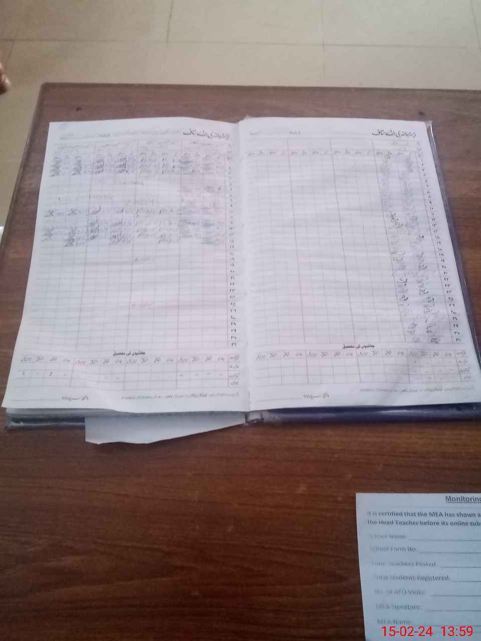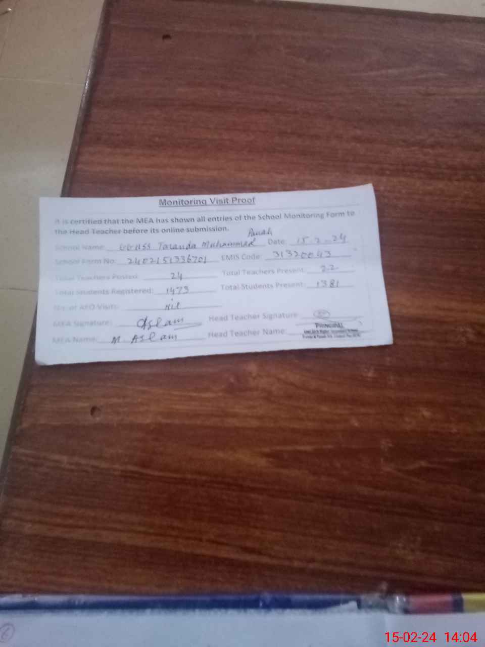 | Attendance Register | Head Teacher | MEA with School | Visit Proof |