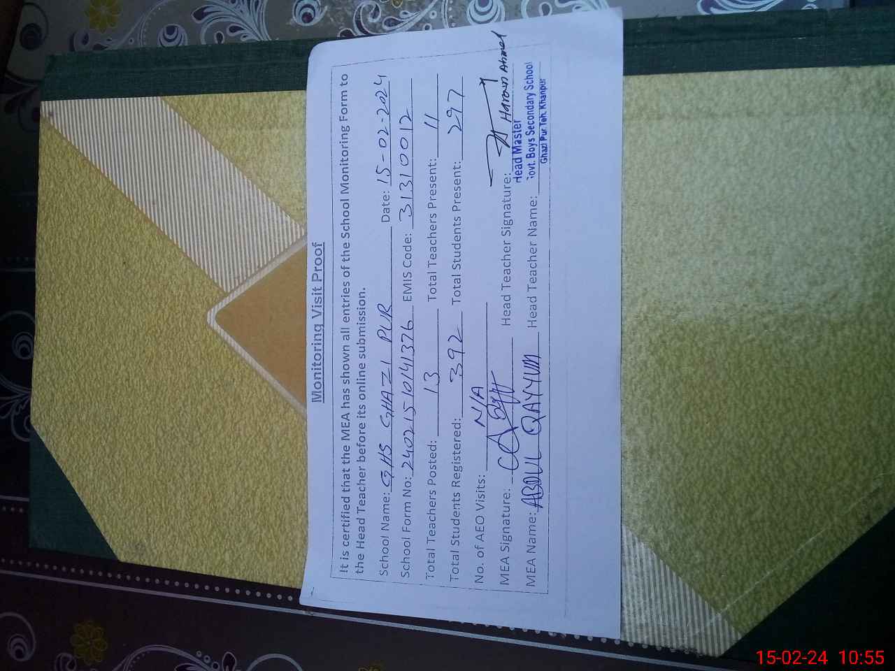 | Attendance Register | Head Teacher | MEA with School | Visit Proof |