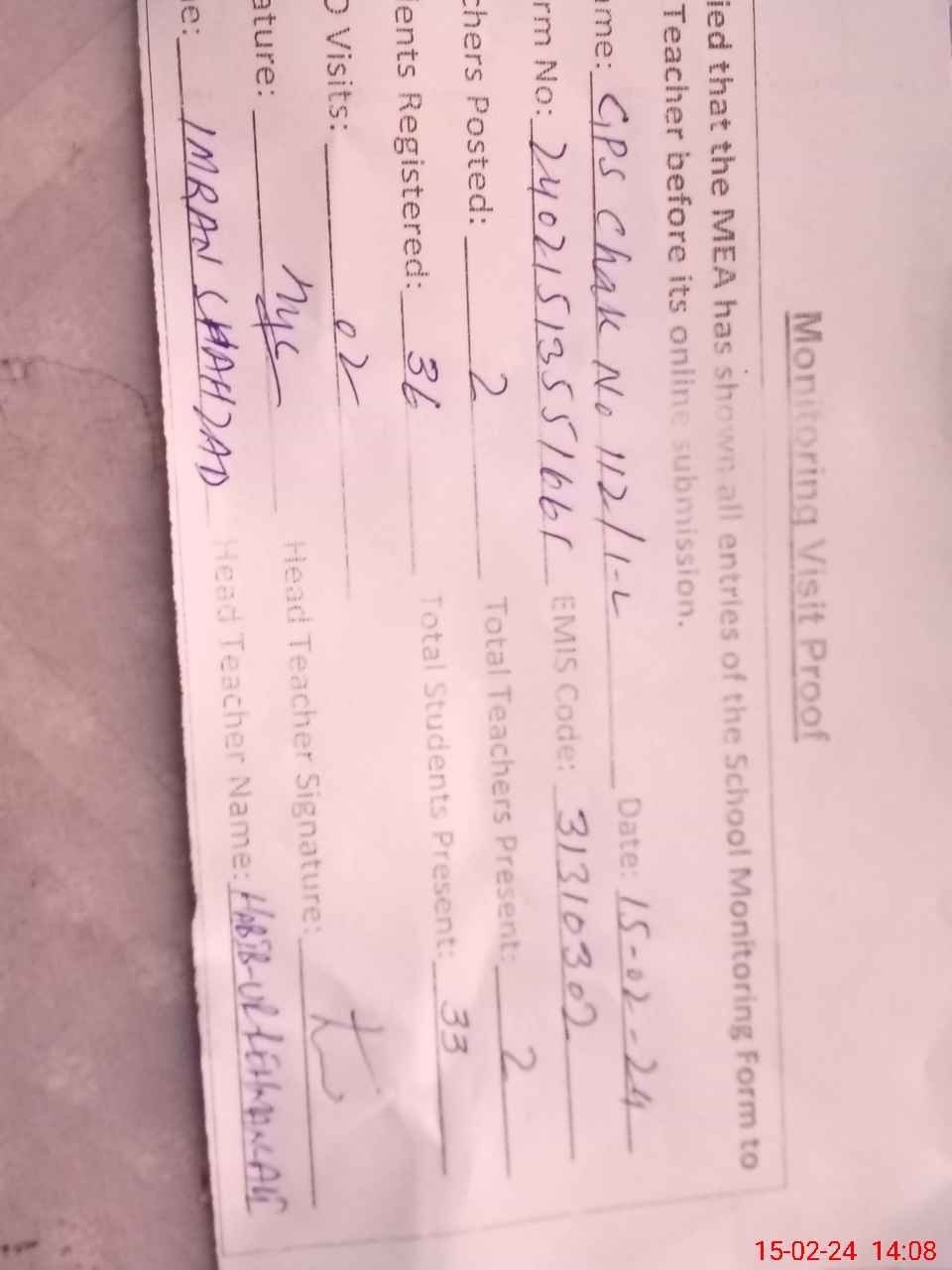 | EMIS Code: 31310302 | Name of School: GPS CHAK NO 112/1-L | |||