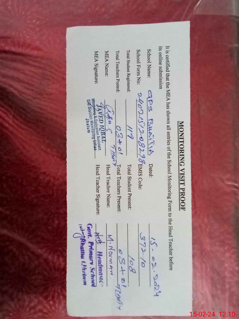 | Certified that this School was Inspected by the Undersigned MEA/DMO Today and the Information Stated Above is as Per Record. | |||||