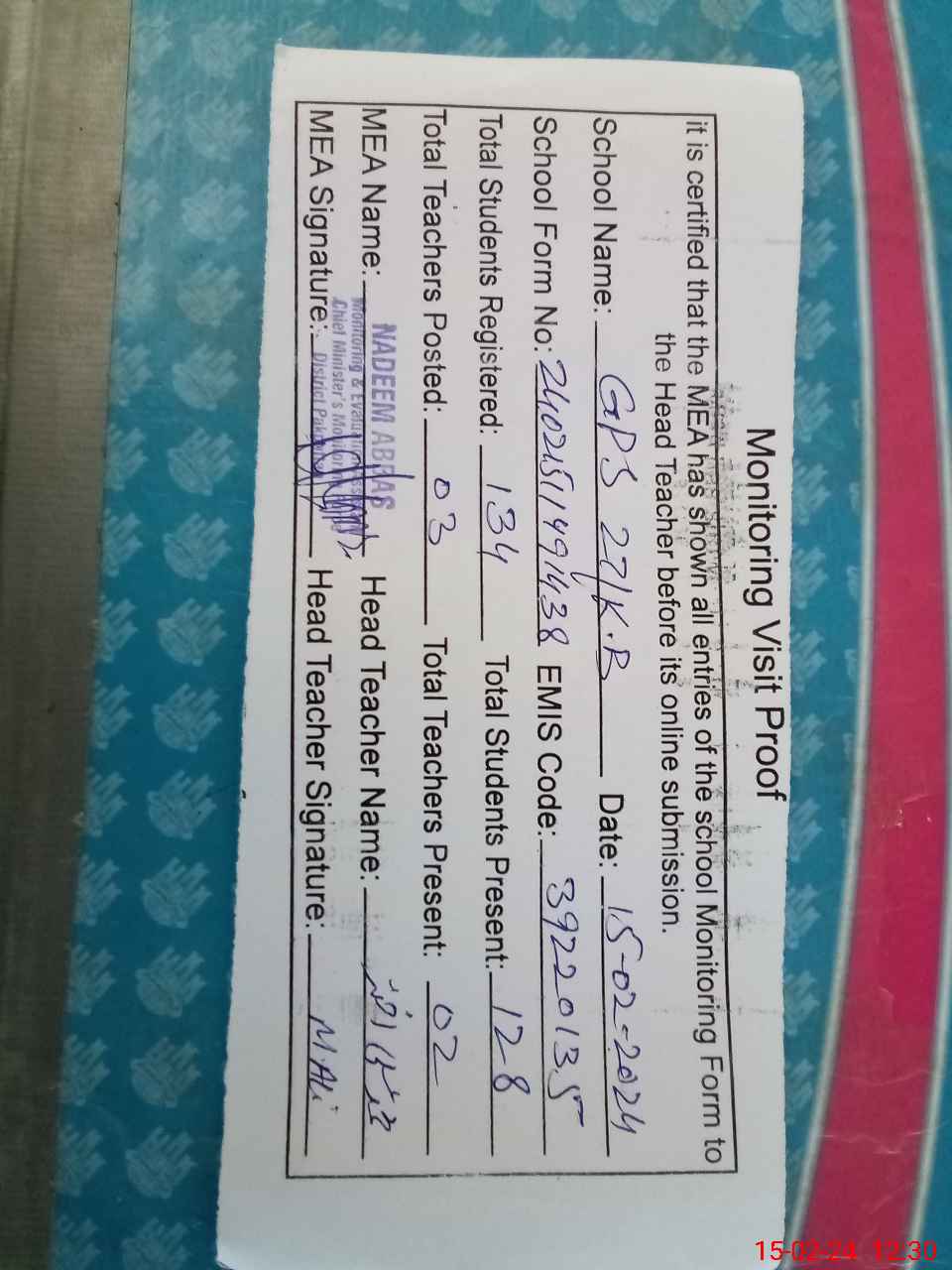 | Attendance Register | Head Teacher | MEA with School | Visit Proof |