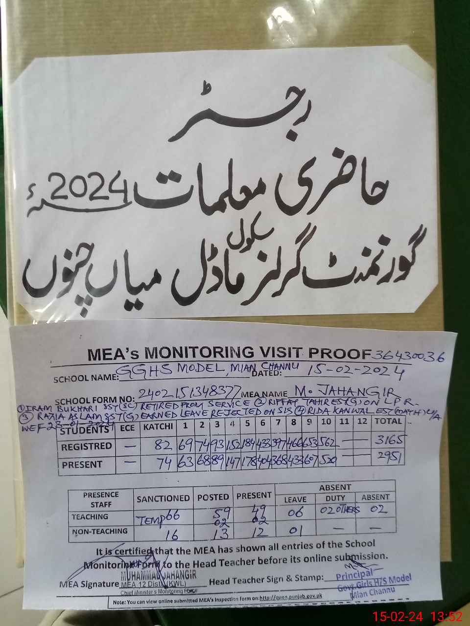 | Certified that this School was Inspected by the Undersigned MEA/DMO Today and the Information Stated Above is as Per Record. | |||||
