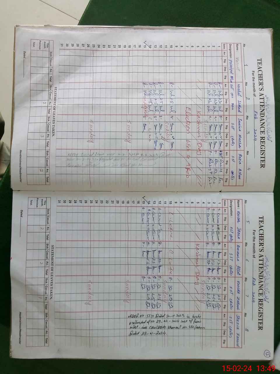| Remarks (Use Separate Page if Required): IRAM BUKHARI SST SC HAS BEEN RETIRED FROM SERVICE RIFFAT TAHIR EST GENERAL IS ON LPR RAZIA ASLAM SST GENERAL FOUND UN AUTHORISED HER EARNED LEAVE IS REJECTED ON SIS RIDA KANWAL EST MATH ALSO FOUND ABSENT FROM DUTY FROM 23 JANUARY 2024 TO TILL RANDOM CLASS NINE K IS PASSED OUT FROM THIS SCHOOL | |||||