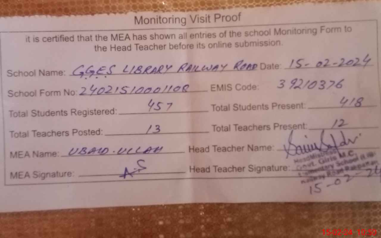 | EMIS Code: 39210376 | Name of School: GGES MC NO. 1 LIBRARY RAILWAY ROAD | |||