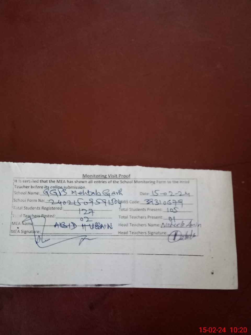 | Attendance Register | Head Teacher | MEA with School | Visit Proof |