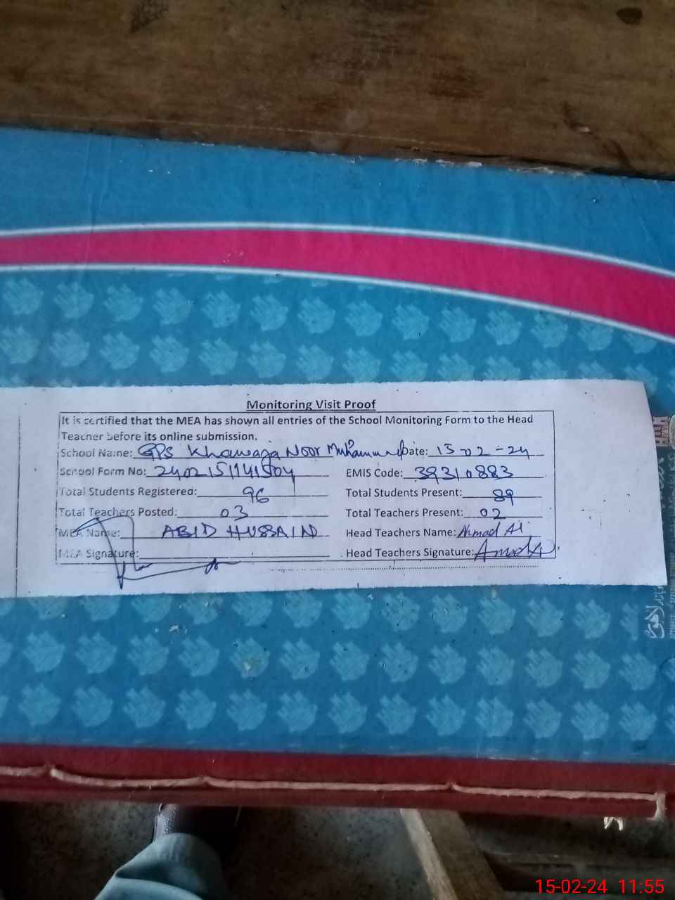 | EMIS Code: 39310883 | Name of School: GPS KHAWAJA NOOR MUHAMMAD | |||