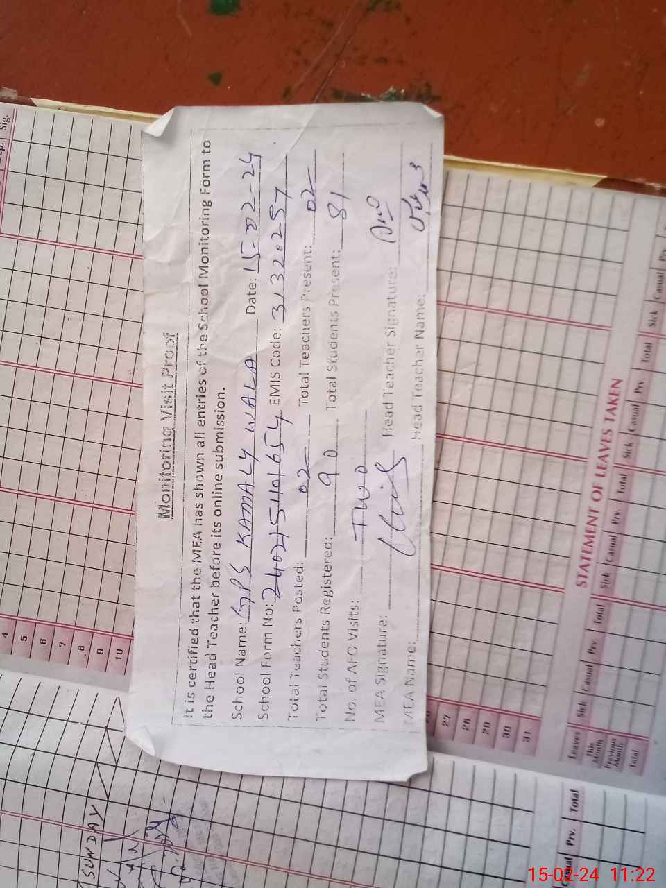 | Attendance Register | Head Teacher | MEA with School | Visit Proof |