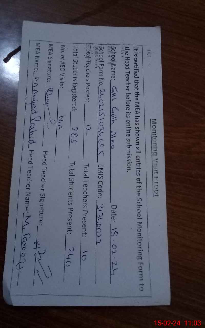 | EMIS Code: 31340022 | Name of School: GHS GOTH ALOO | |||
