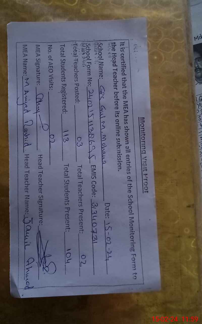 | EMIS Code: 31340731 | Name of School: GPS GUL MUHAMMAD MOHANA | |||