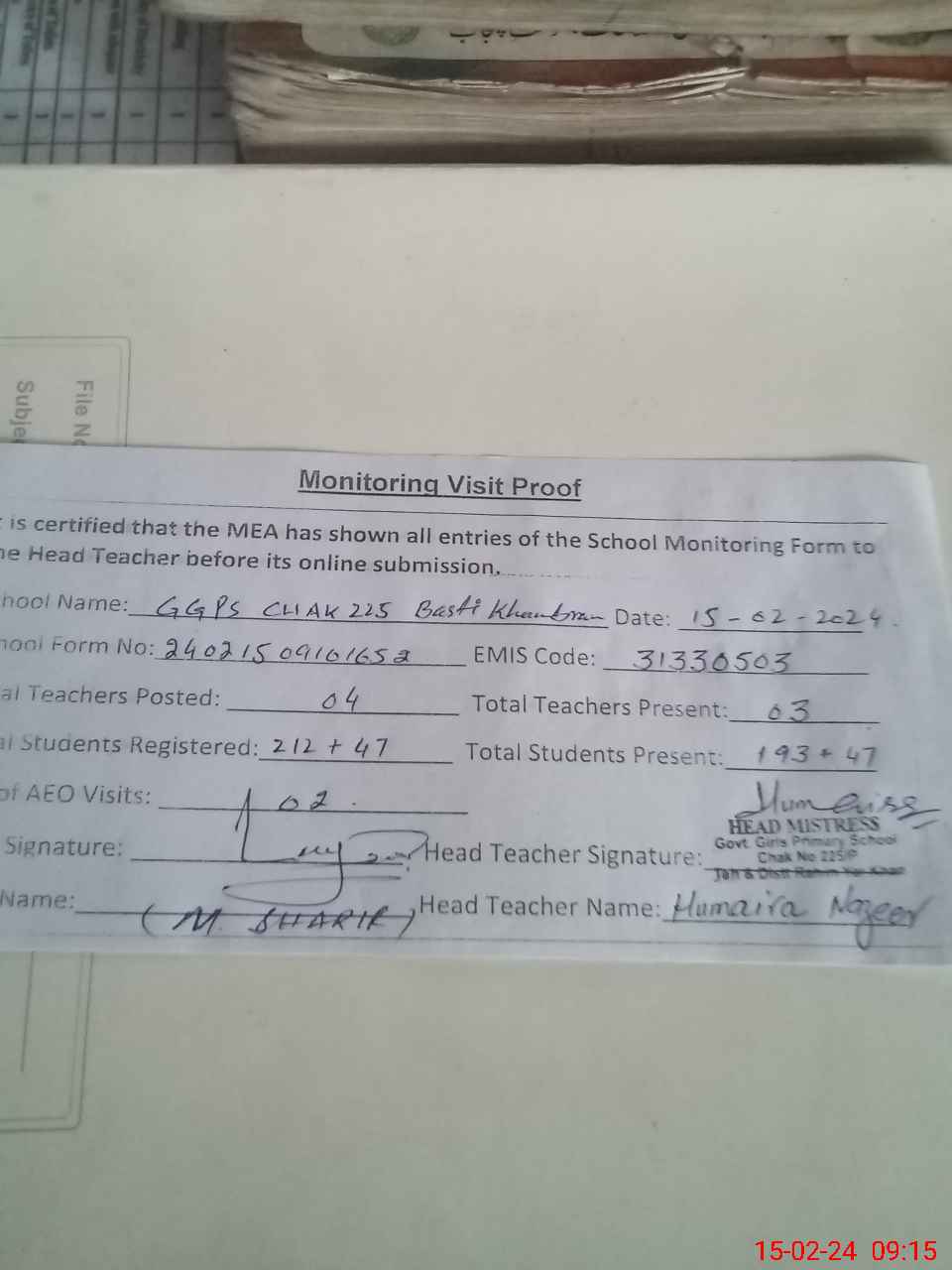 | Attendance Register | Head Teacher | MEA with School | Visit Proof |