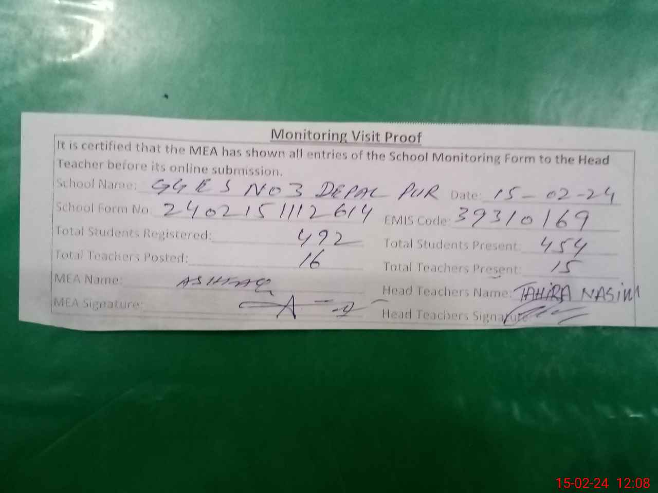 | Attendance Register | Head Teacher | MEA with School | Visit Proof |