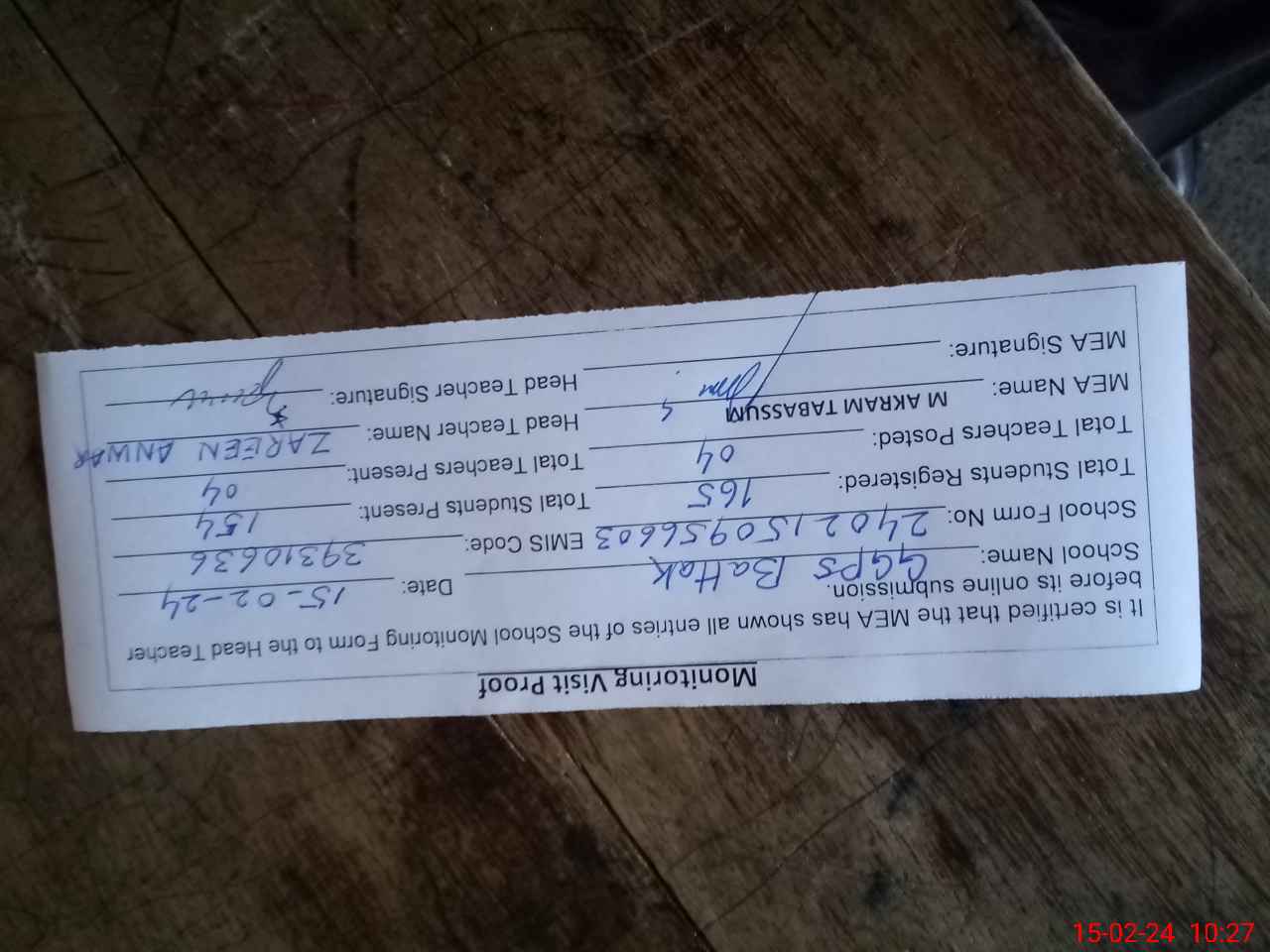 | Attendance Register | Head Teacher | MEA with School | Visit Proof |