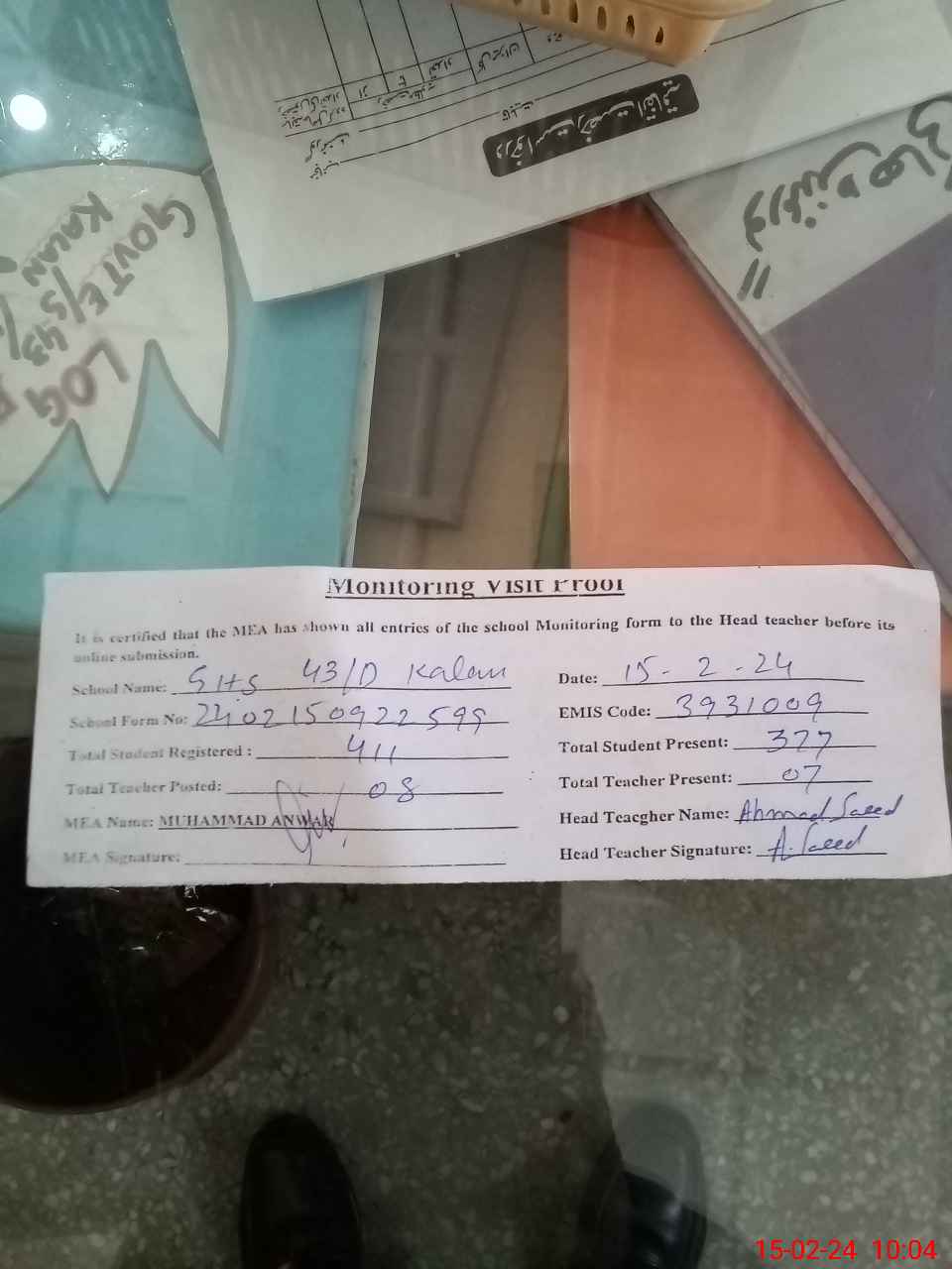 | Attendance Register | Head Teacher | MEA with School | Visit Proof |
