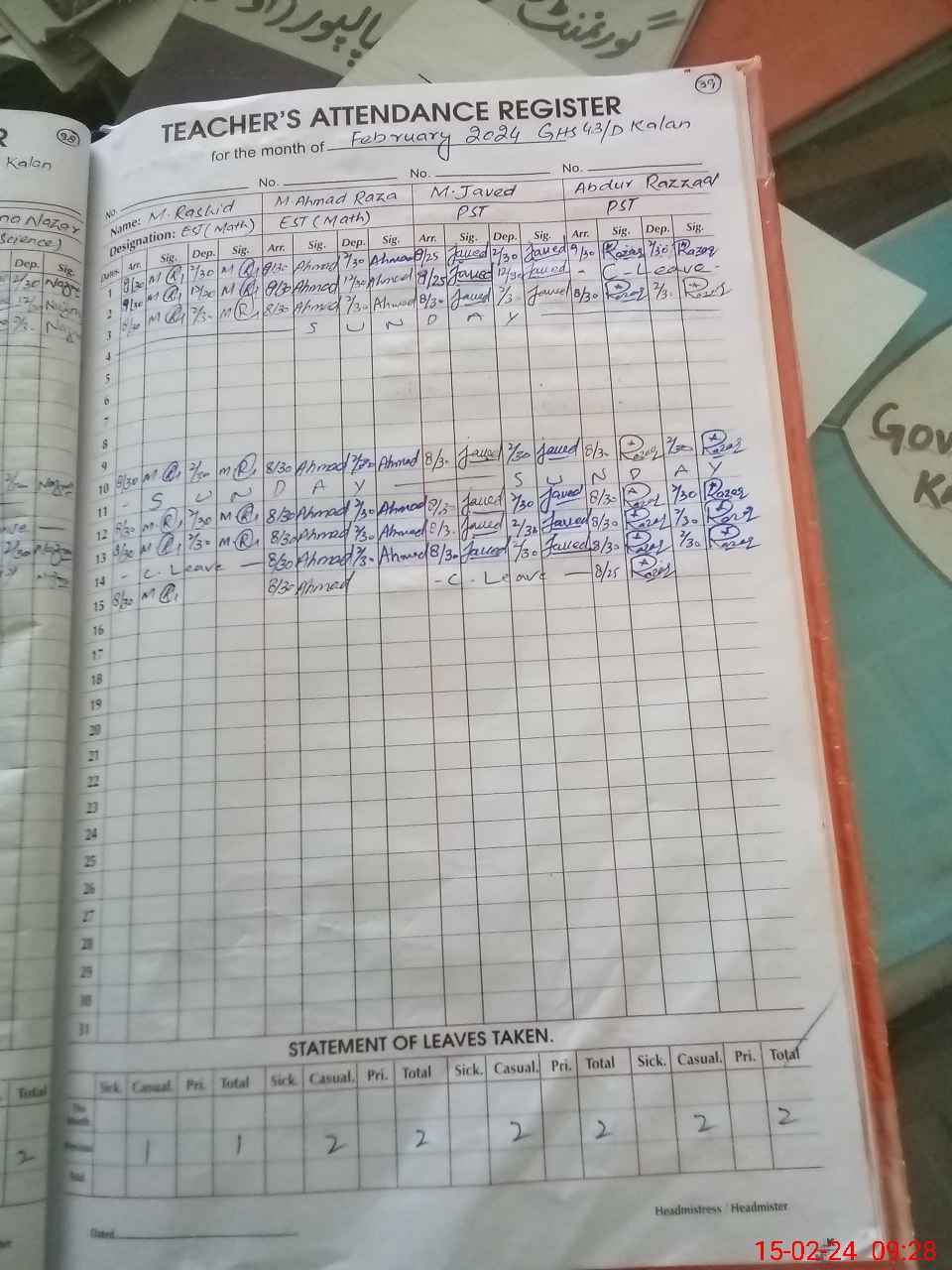 | CNIC | Full Name | Designation | R/C | Absence During Last Calender Month |