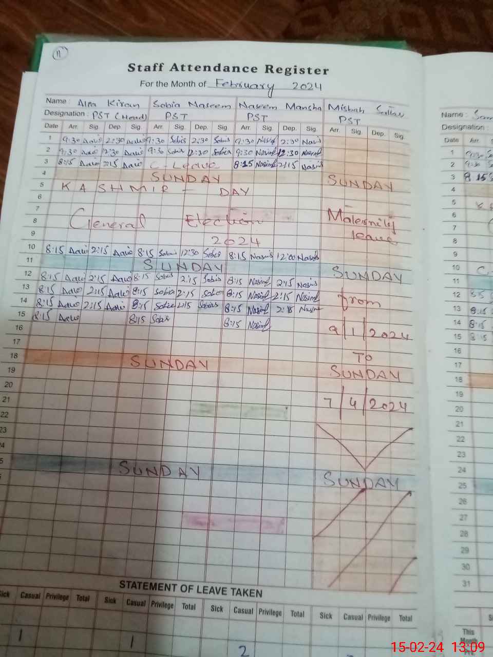| Leave | Duty | Absent | Maternity | Medical | Ex- Pak |