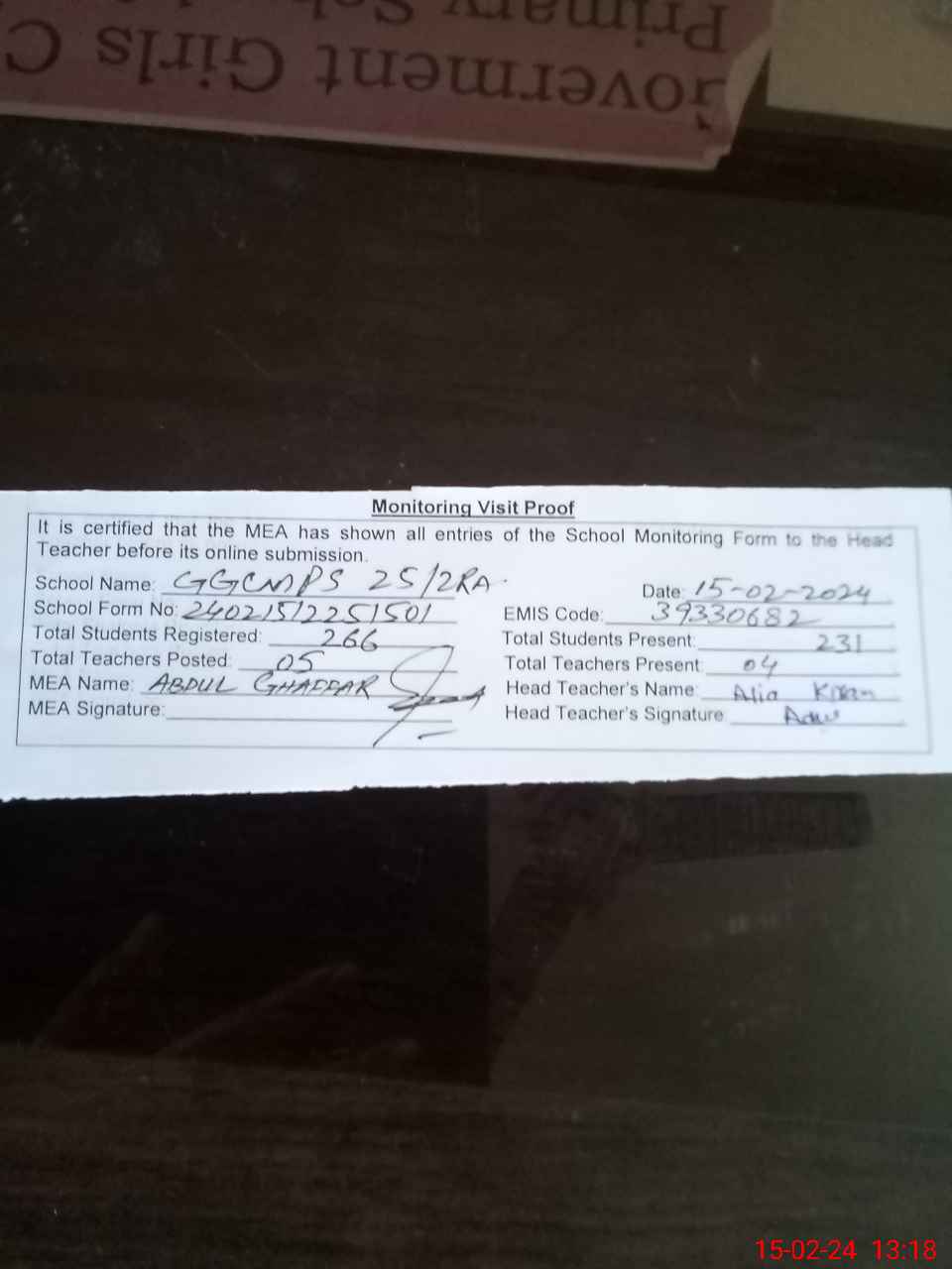| Attendance Register | Head Teacher | MEA with School | Visit Proof |