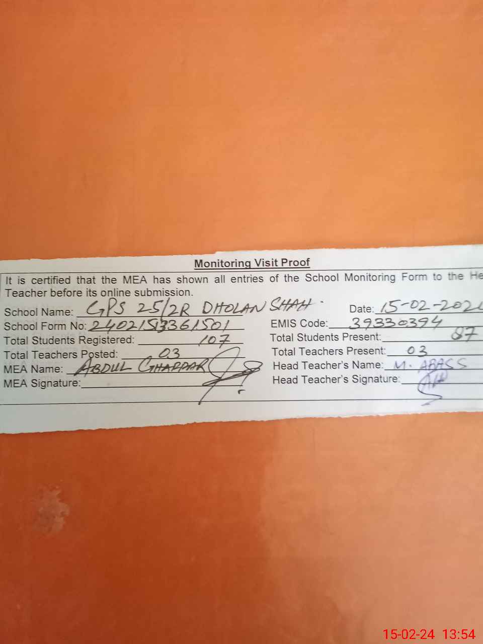 | EMIS Code: 39330394 | Name of School: GPS CHAK NO. 25/2-R DHOLAN SHAH | |||