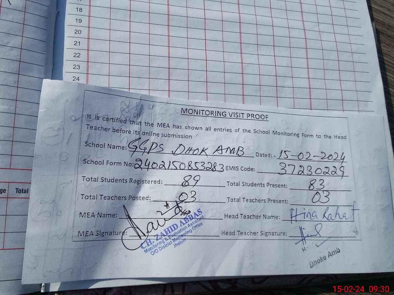 | EMIS Code: 37230229 | Name of School: GGPS DHOK AMB | |||