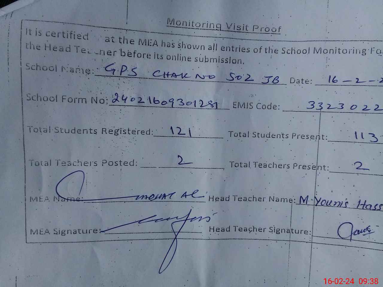 | Attendance Register | Head Teacher | MEA with School | Visit Proof |