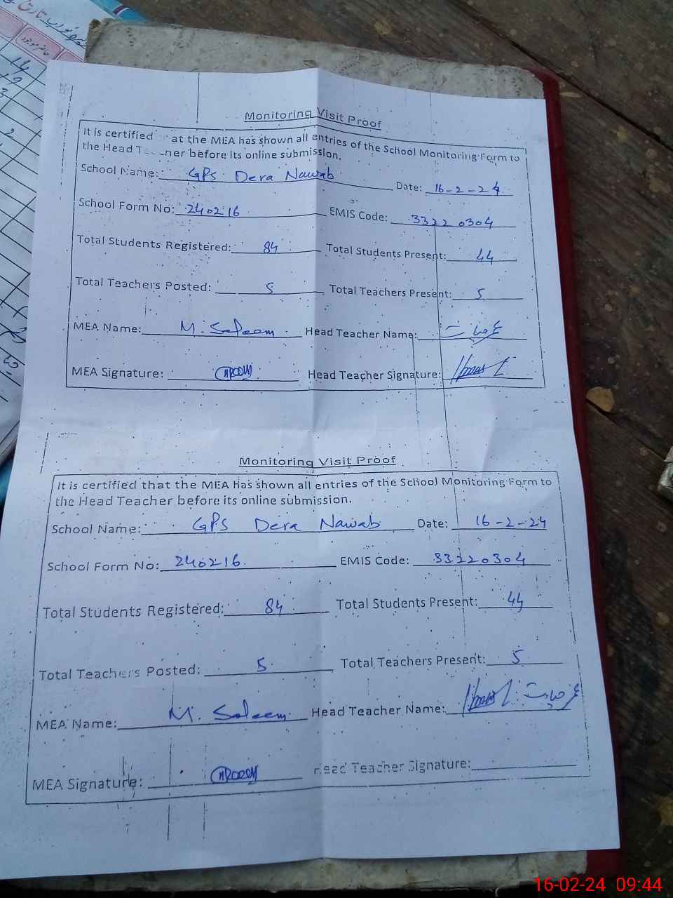 | EMIS Code: 33220304 | Name of School: GPS DERA NAWAB | |||