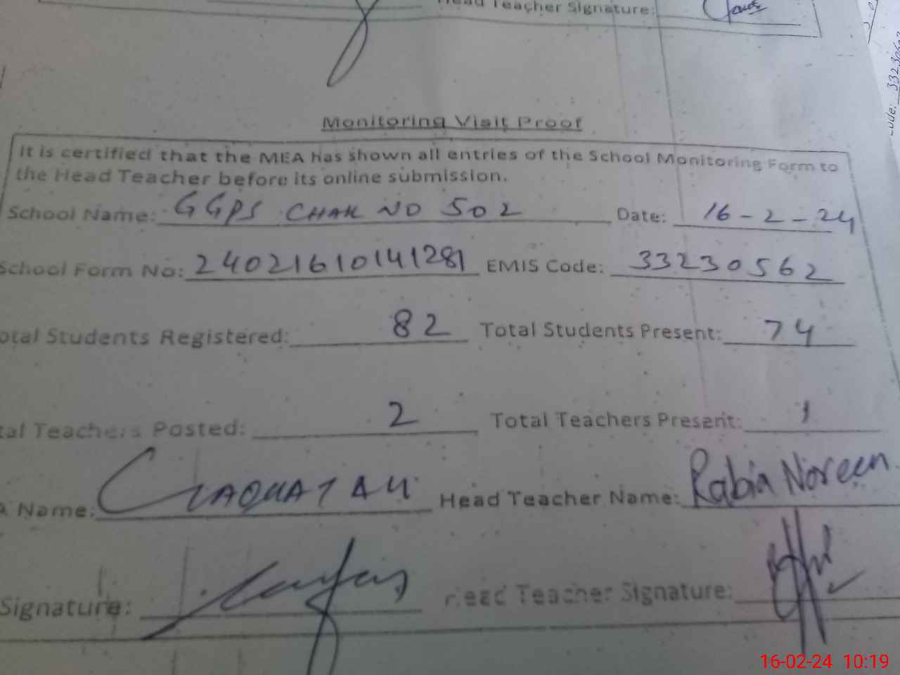 | Certified that this School was Inspected by the Undersigned MEA/DMO Today and the Information Stated Above is as Per Record. | |||||