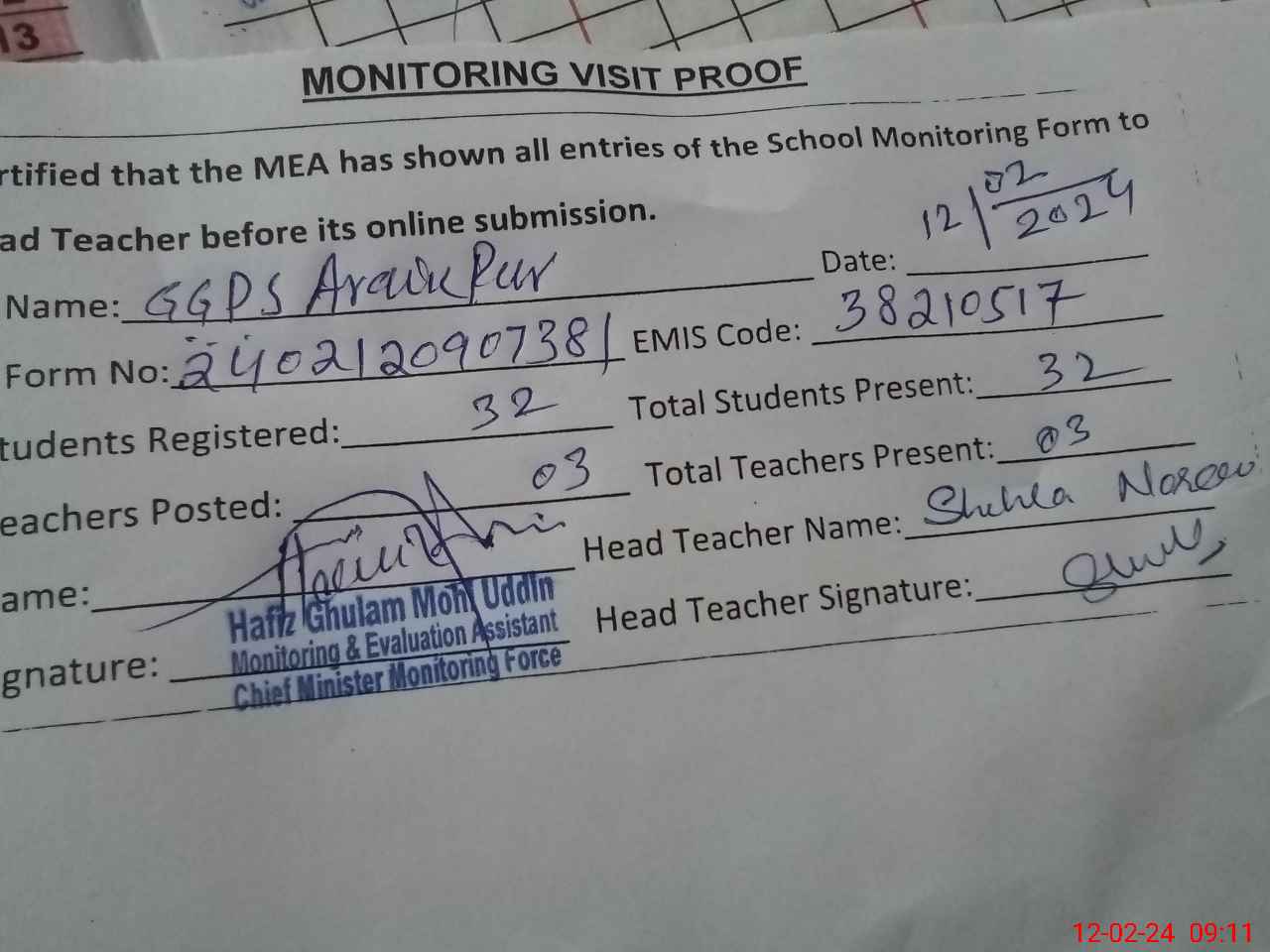 | Attendance Register | Head Teacher | MEA with School | Visit Proof |