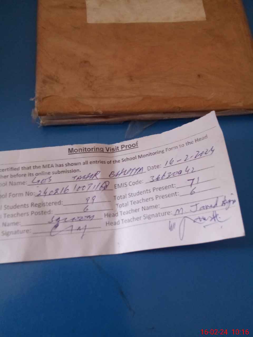 | Attendance Register | Head Teacher | MEA with School | Visit Proof |