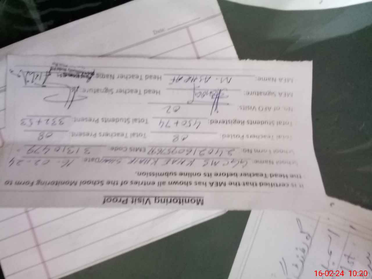 | Attendance Register | Head Teacher | MEA with School | Visit Proof |