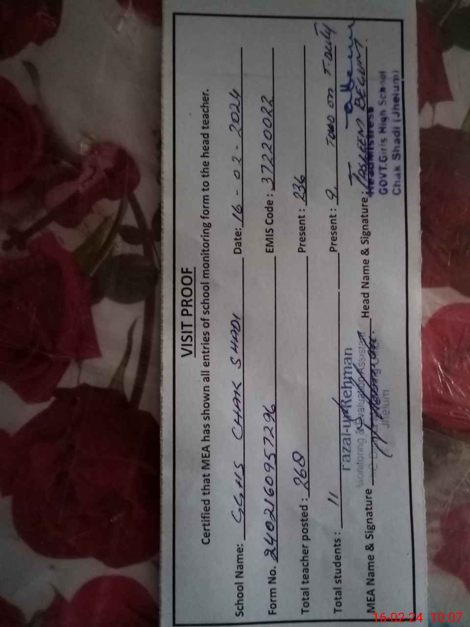 | Certified that this School was Inspected by the Undersigned MEA/DMO Today and the Information Stated Above is as Per Record. | |||||