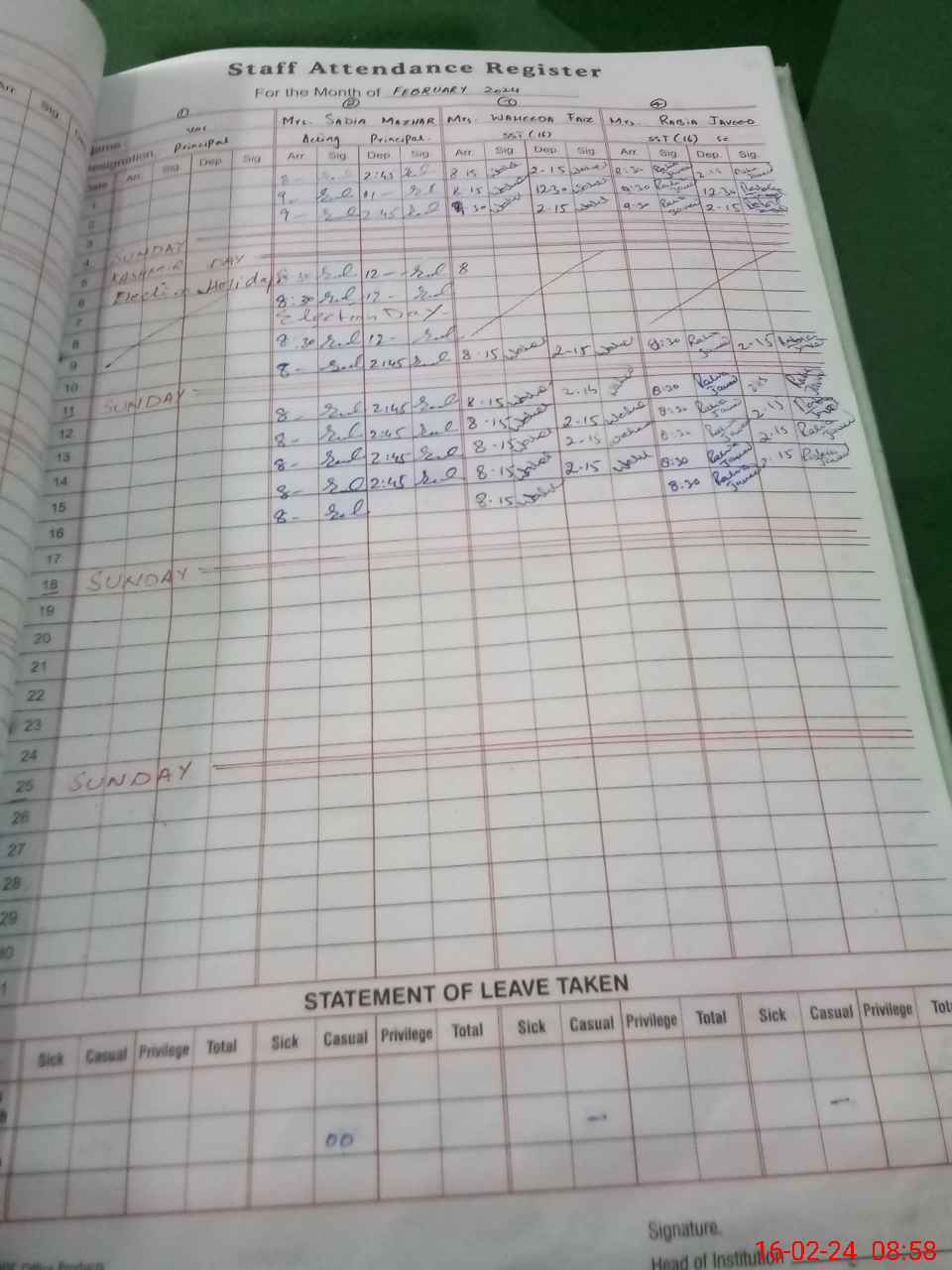 | CNIC | Full Name | Designation | R/C | Absence During Last Calender Month |