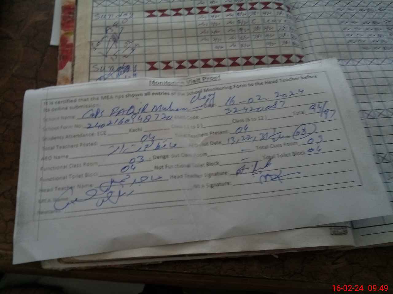 | Attendance Register | Head Teacher | MEA with School | Visit Proof |