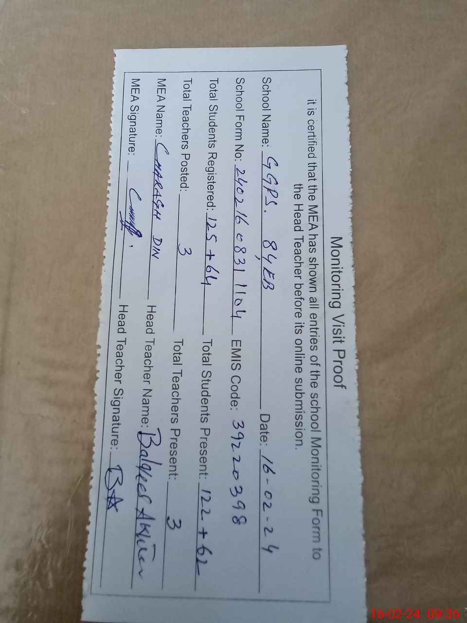 | Attendance Register | Head Teacher | MEA with School | Visit Proof |