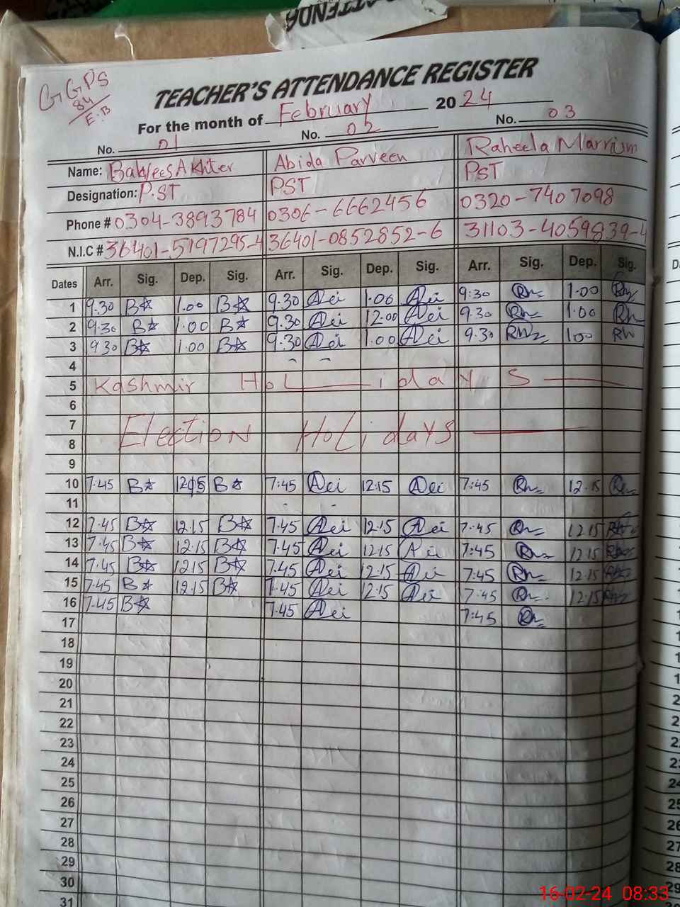 | CNIC | Full Name | Designation | R/C | Absence During Last Calender Month |